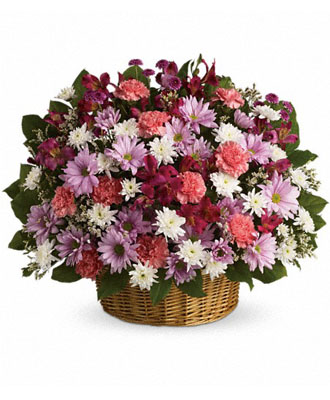 Featuring an array of dazzling flowers that are both soft and comforting, this bouquet is bursting with vibrant colors, including pretty pink carnations, white cushion spray chrysanthemums, lavender button, daisy spray chrysanthemum, and alstroemeria. It is a true representation of love, affection, devotion, and sympathy that's bound to leave the recipient speechless.